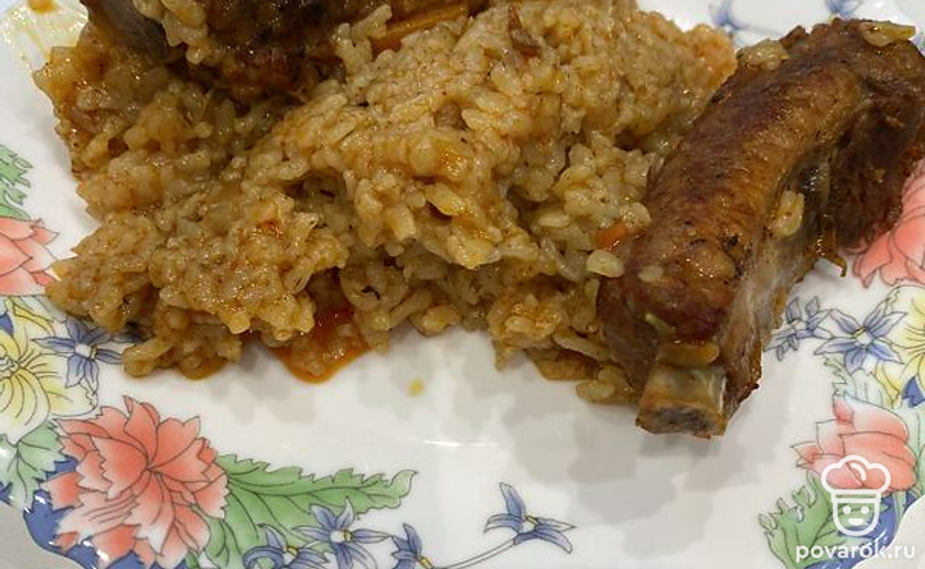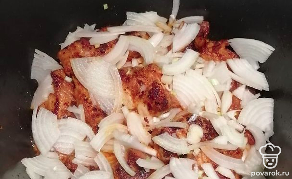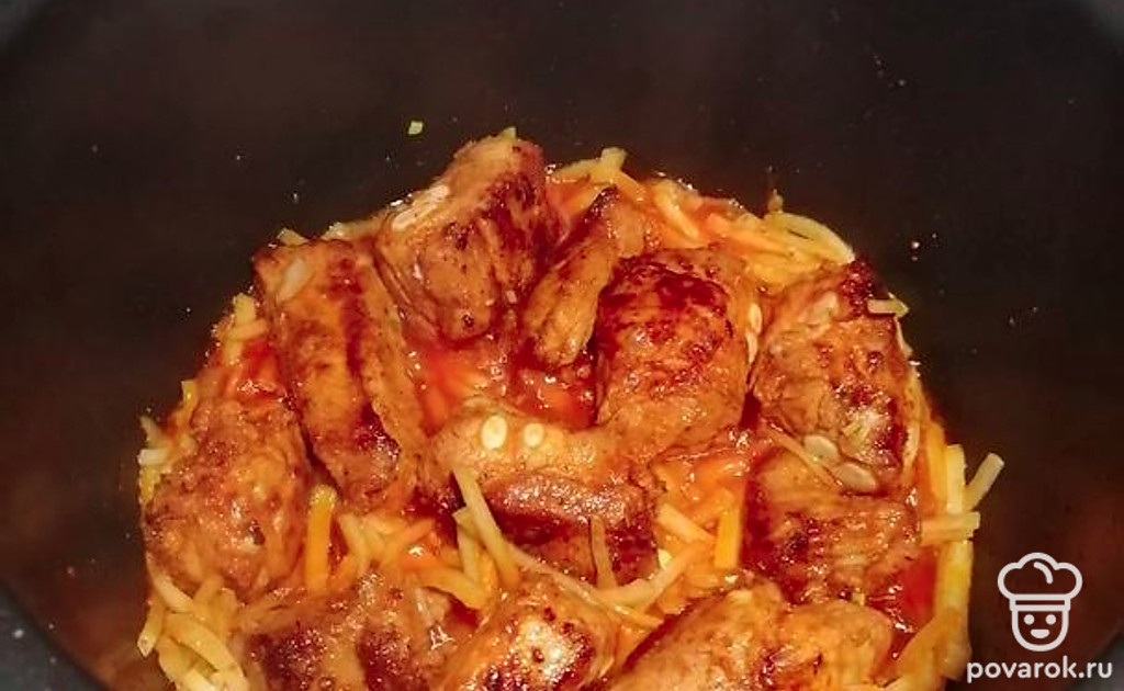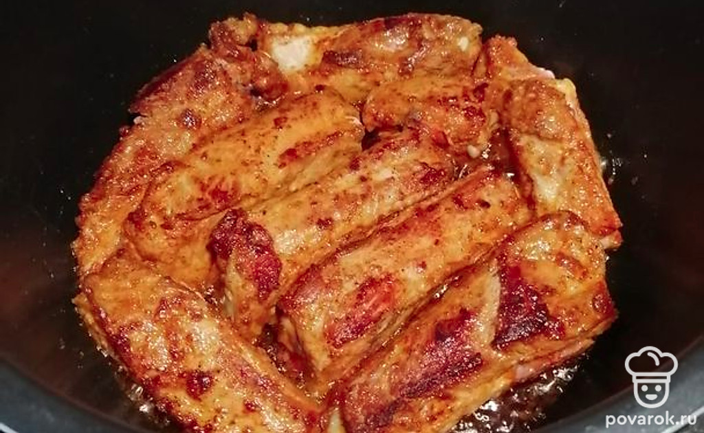 Свиные рёбрышки обжарить на растительном масле в чаше мультиварки до золотистой корочки.