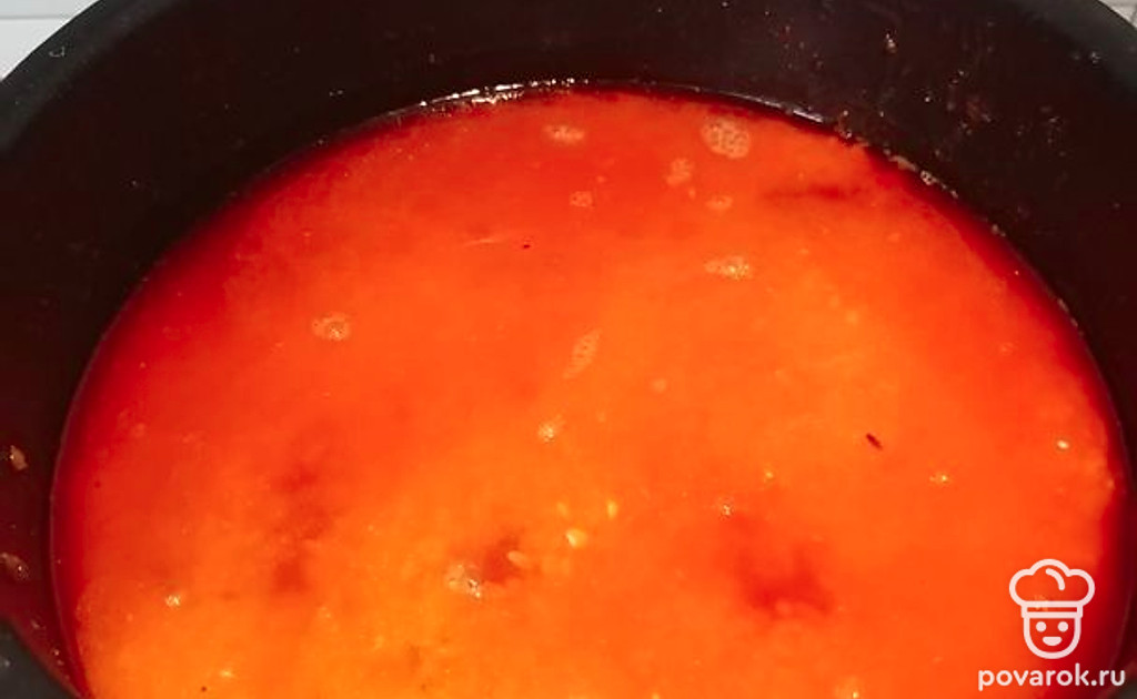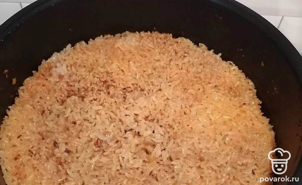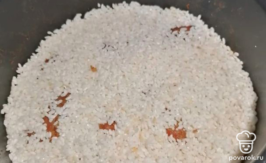 Залить водой из расчёта на 1 стакан риса на 2 стакана воды. Закрыть чашу мультиварки, закрыть клапан и установить режим Тушение/Плов на 20 минут.