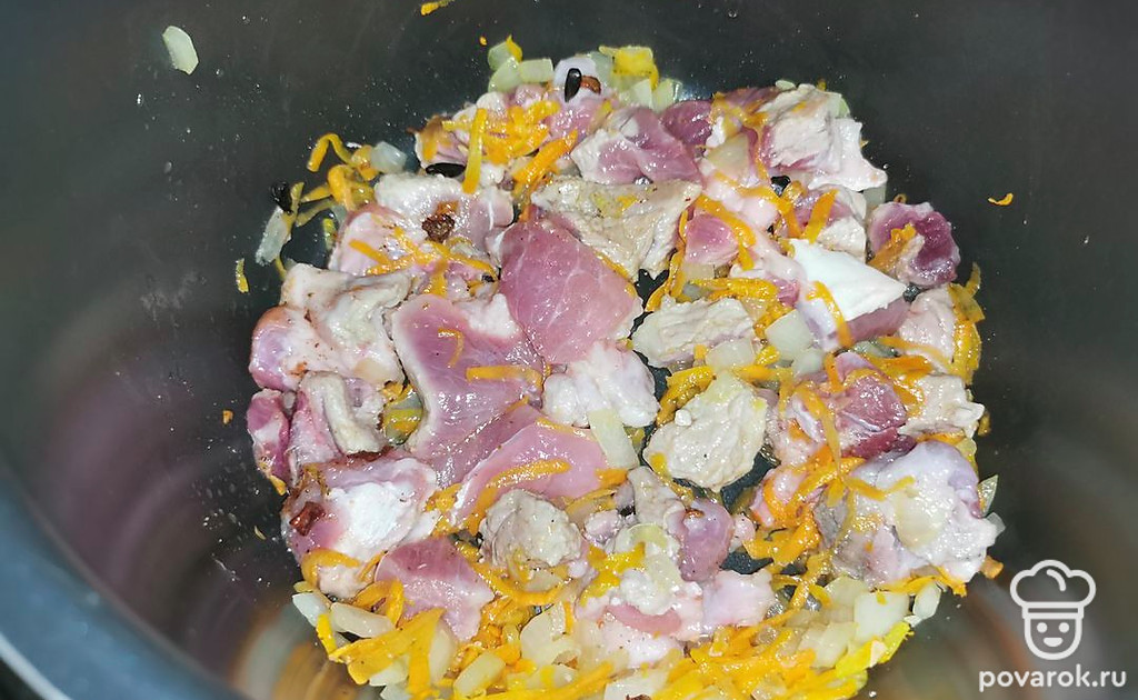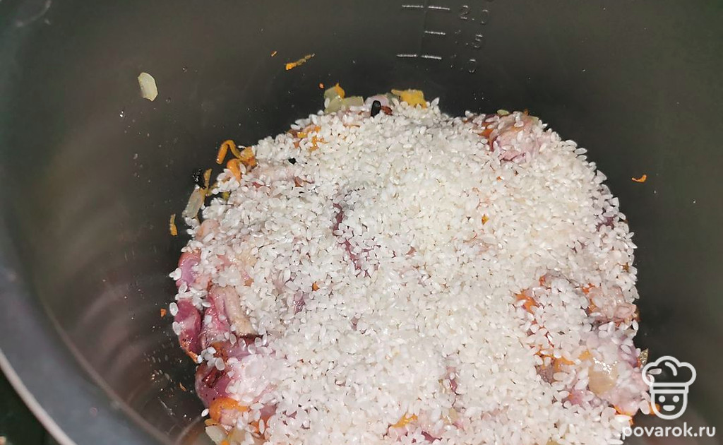 Добавить 1 мультистакан воды. Выставить на мультиварке программу плов, закрыть крышку. Время приготовления 25 минут.