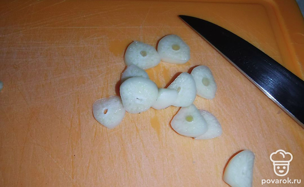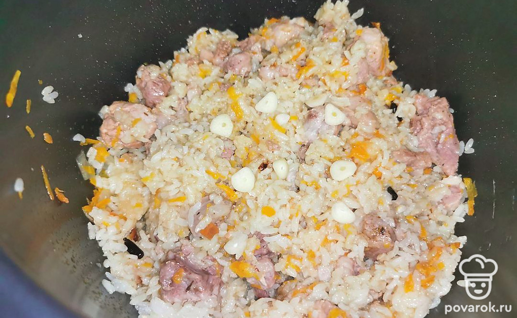 Добавить чеснок к готовому плову и закрыть крышкой на пару минут.