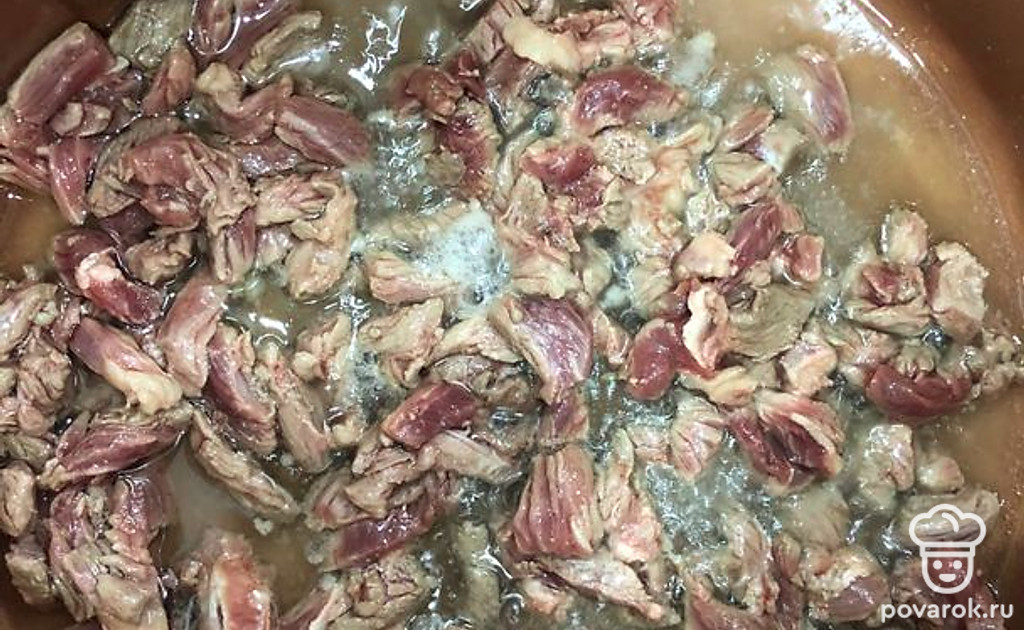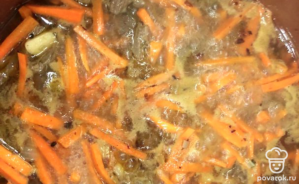 Солим, перчим на вкус. Можно также добавить куркуму, барбарис или приправу для плова. Добавляем воды, чтобы покрылось мясо и тушим под крышкой на среднем огне примерно минут 35.