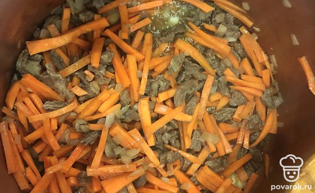 Нарезаем мелко лук, морковь - на брусочки и отправляем к говядине. Обжариваем 5-7 минут.