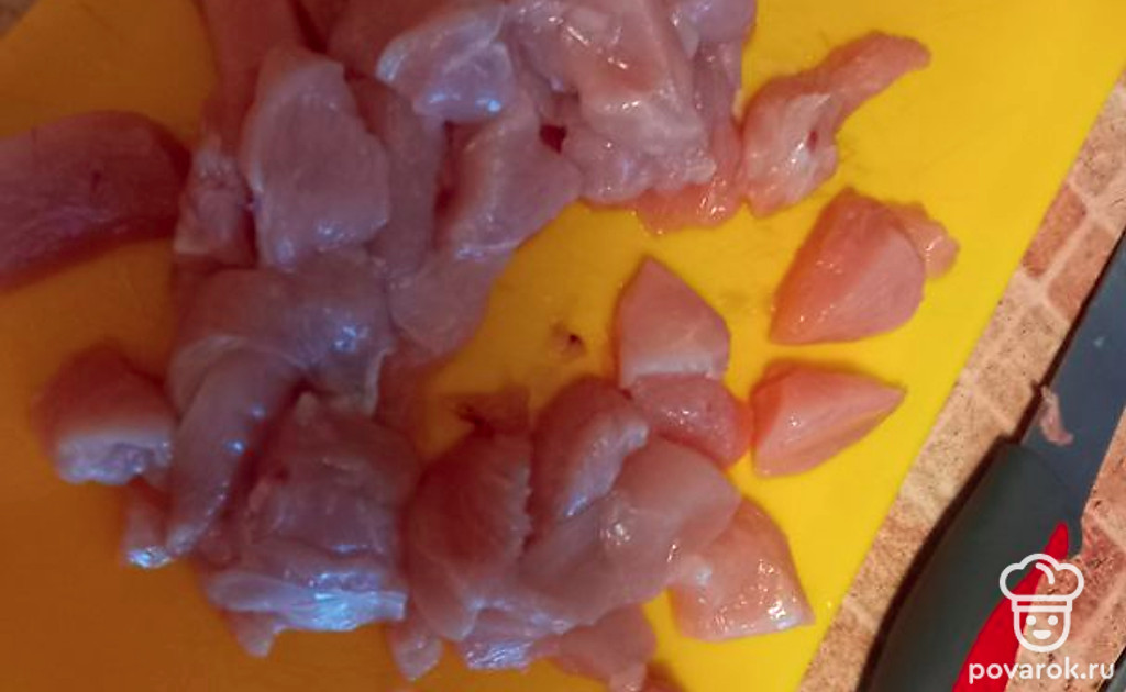 Нарезать кубиками мясо, у меня свинина. Смазать солью, сахаром и приправами.