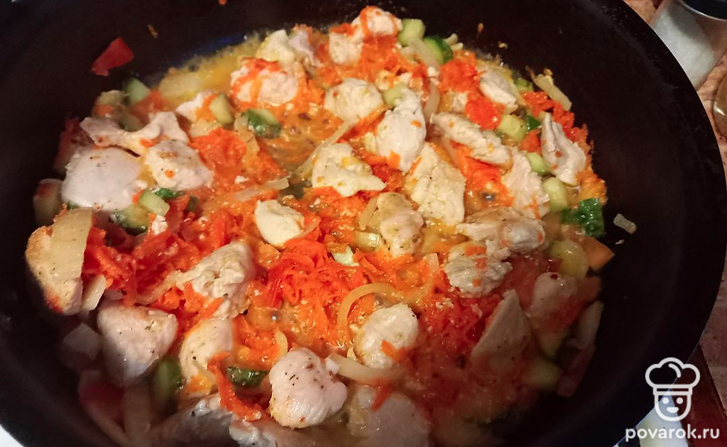 Немного потомить, приправить морковкой и залить пол стакана водички.