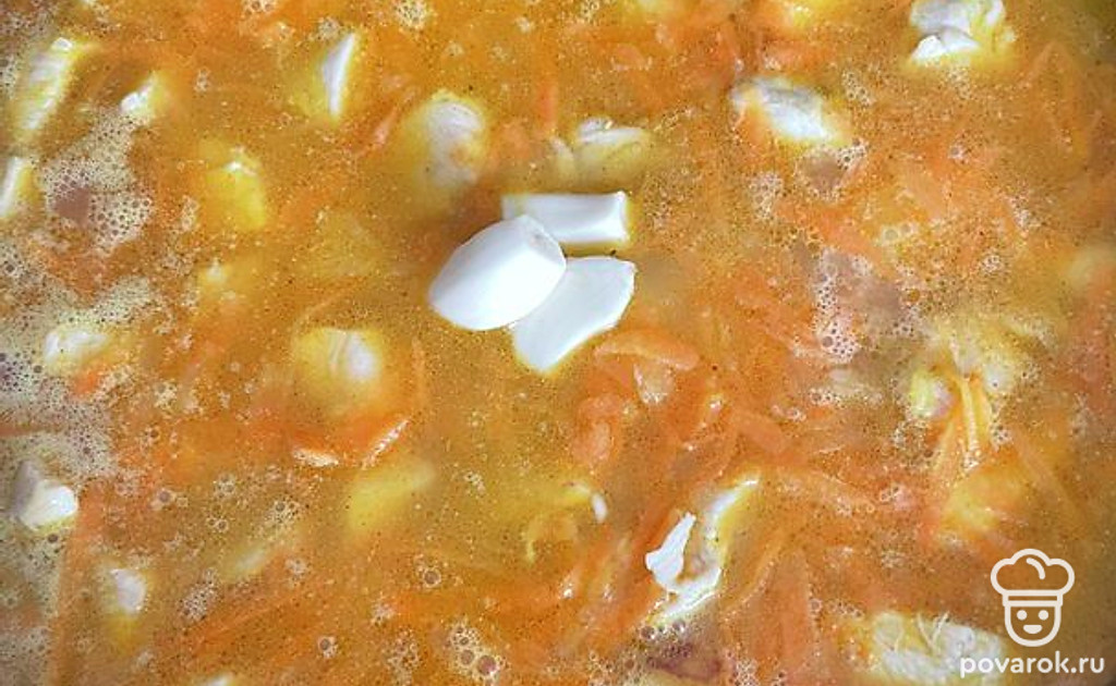 Залейте чистой водой и положите 3 зубчика чеснока.