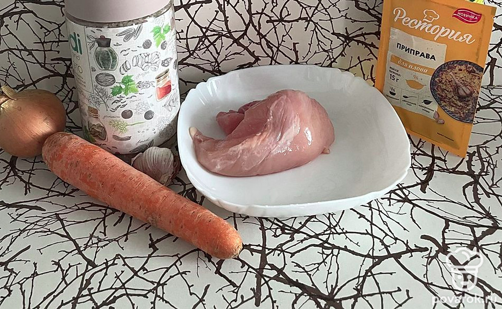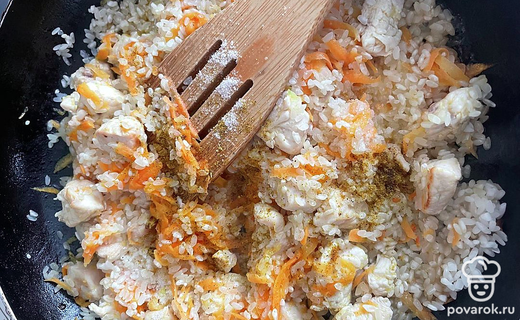 Выложите рис. Перемешайте, добавьте соль и приправу.