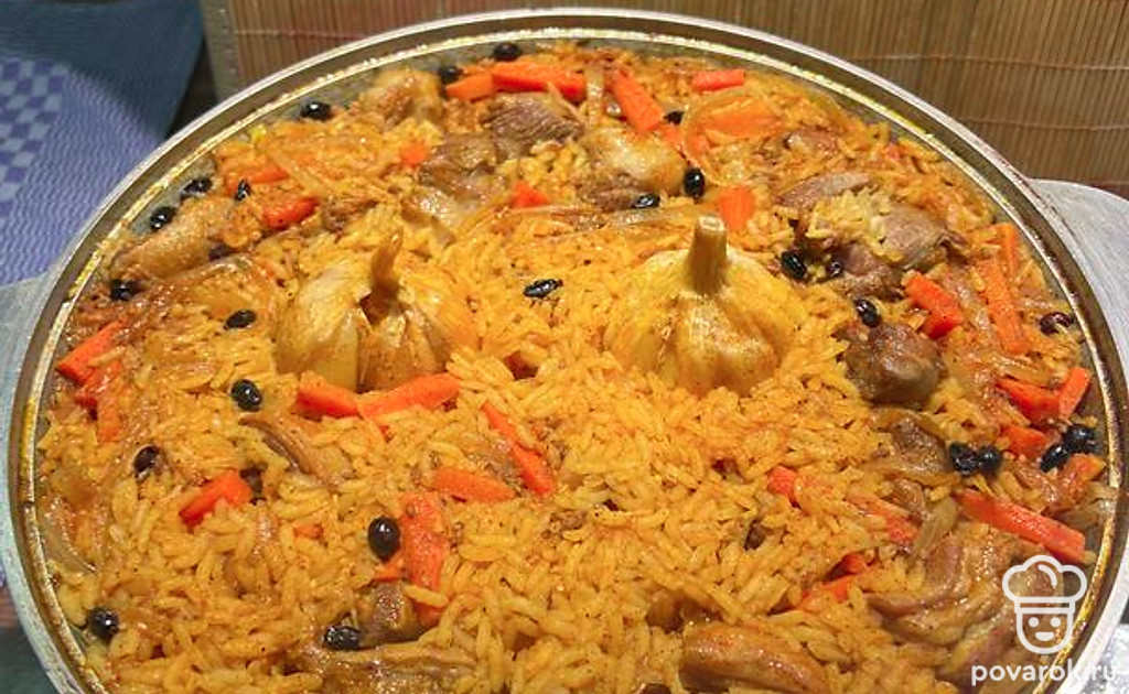 Берем две головки чеснока, не снимая кожуру, отрезаем низ и кладем на плов, чтобы чеснок был наполовину утоплен в воде.