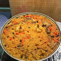 Отправляем в казан с луком и морковью мясо. Высыпаем тщательно промытый рис, засыпаем приправы и соль, перемешиваем. Заливаем водой на два сантиметра выше массы плова.