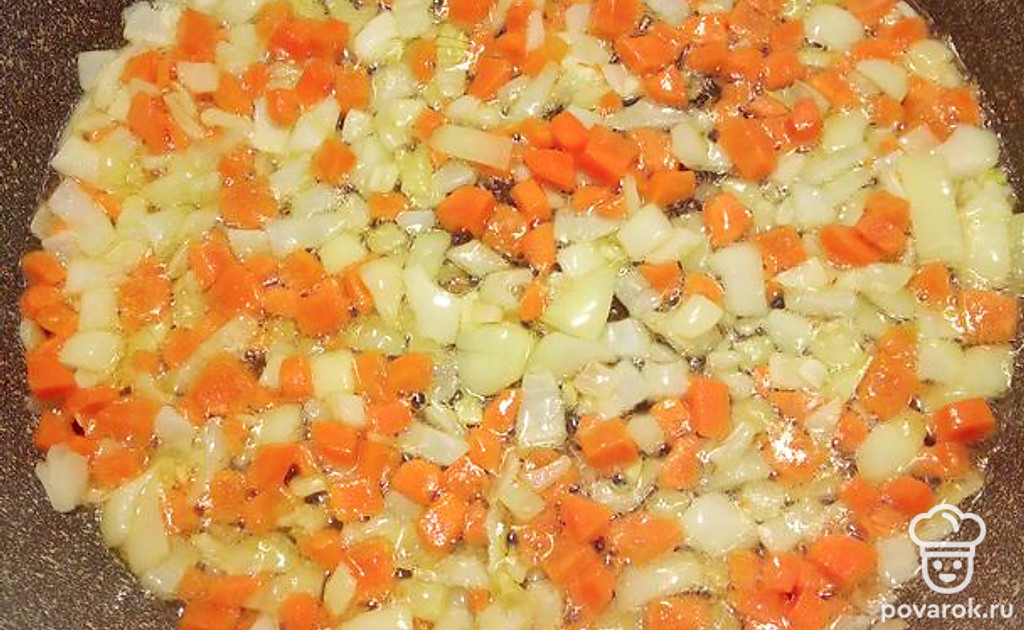 Морковь, лук мелко нарезать. Обжарить на растительном масле.