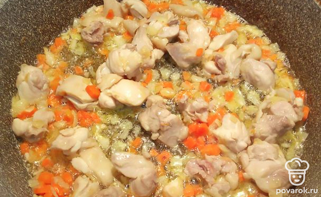 Добавить мелко нарезанное филе курицы, соль специи по вкусу.