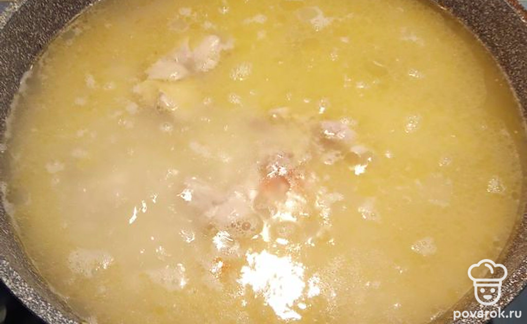 Промыть рис, высыпать сверху, не перемешивая. Залить кипятком. Готовить на среднем огне, крышкой не закрывать.