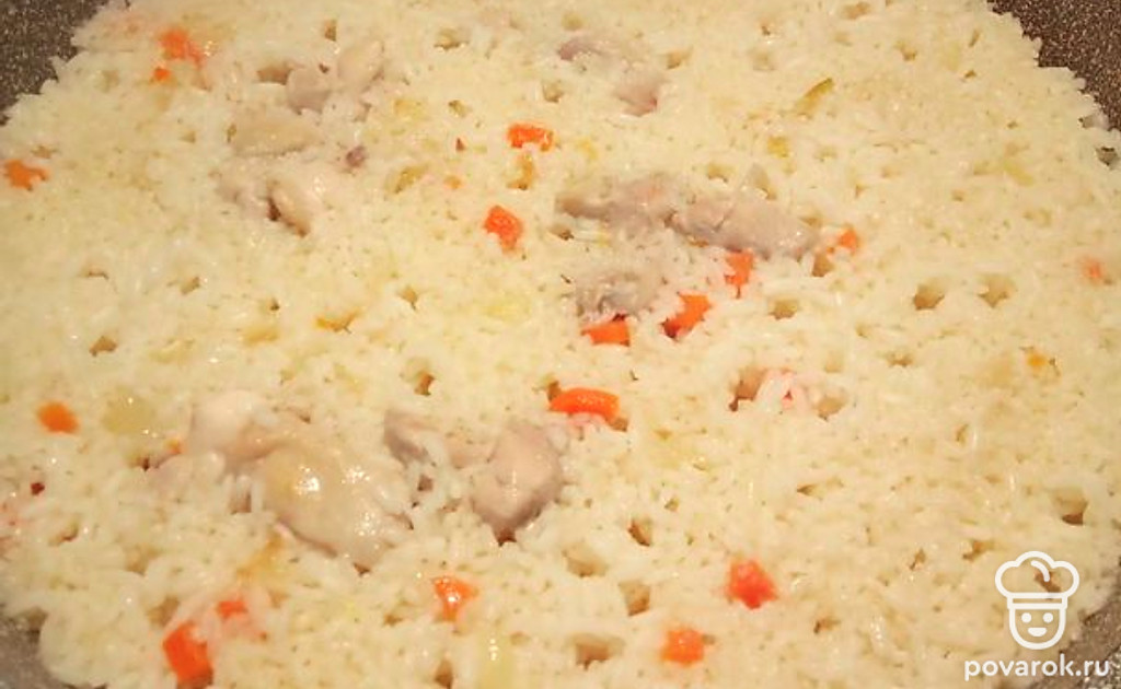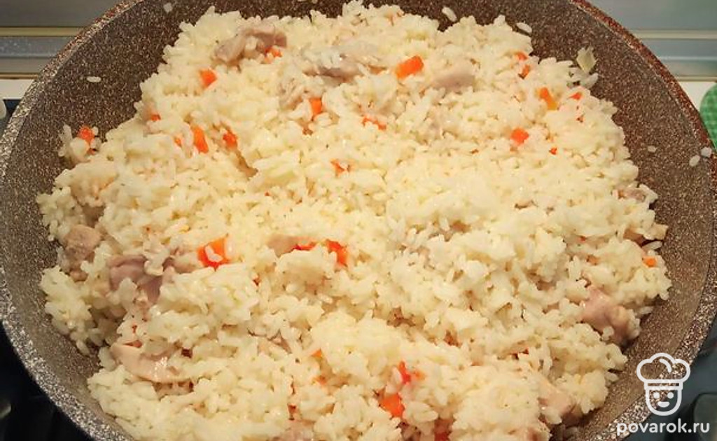 Проверяем готовность риса, при необходимости поливаем воду, не много. Перемешать, закрыть крышкой. Убавить до минимума огонь, через 3 минуты выключить.