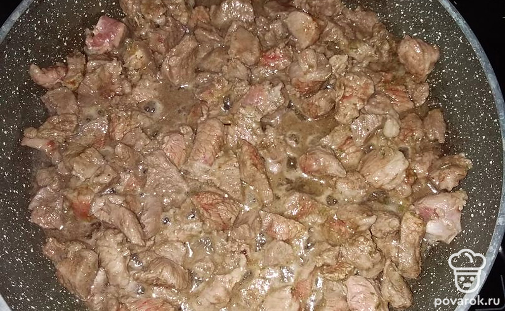Говядину нарезать и отправить готовиться в сковородку минут на 40.