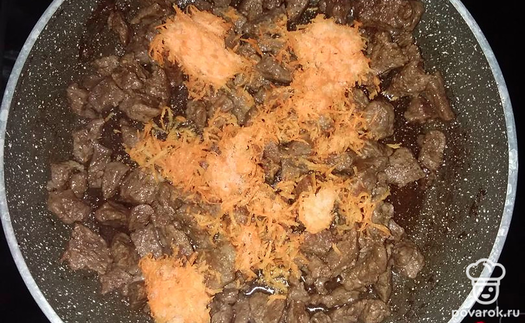 Морковь очистить и натереть на мелкой терке. Добавить к говядине и тушить минут 10.