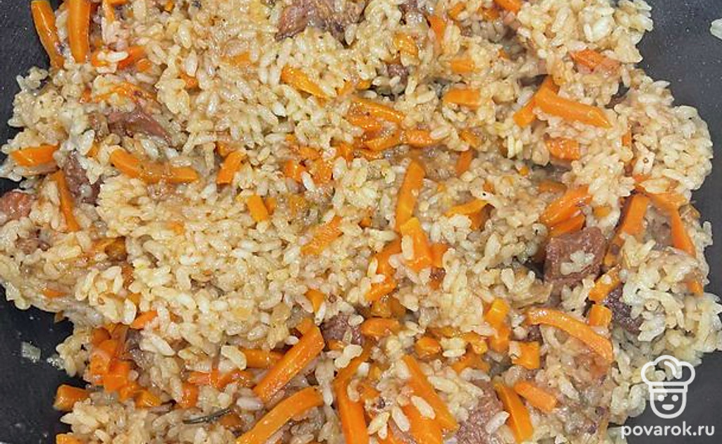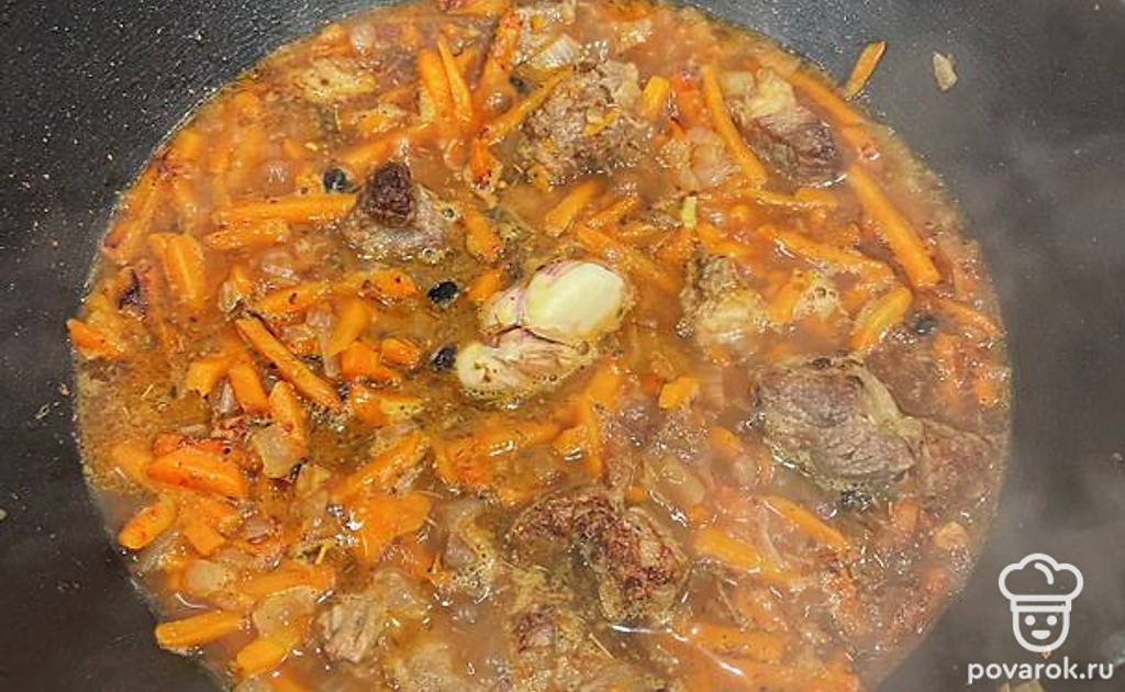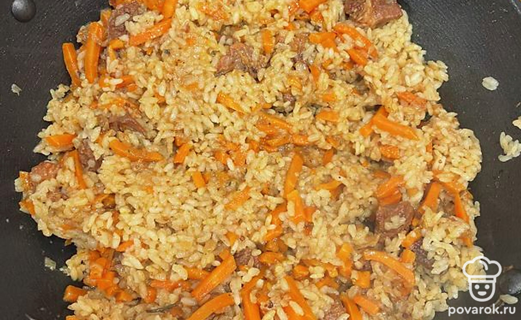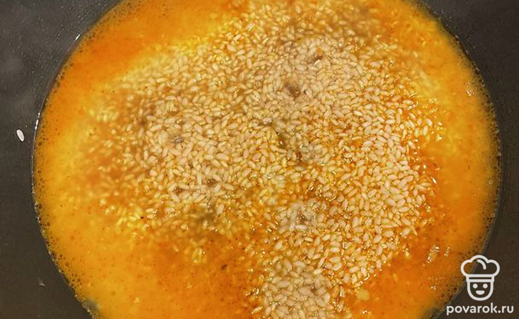 Добавляем рис и еще кипятка. Томим под крышкой на медленном огне 20 минут.