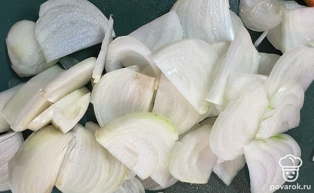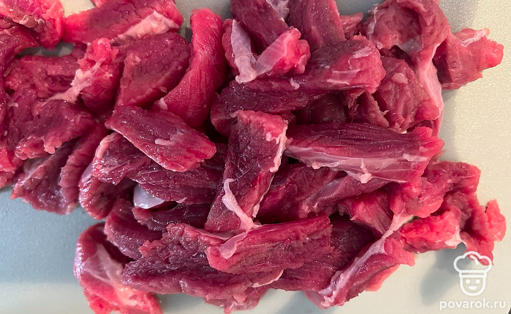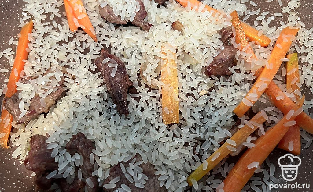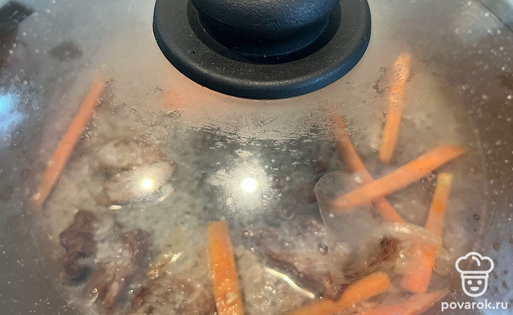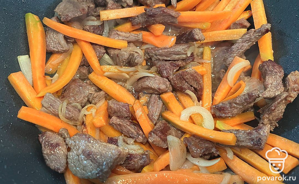 Обжарить мясо с овощами на сковороде примерно 7-10 минут.