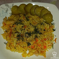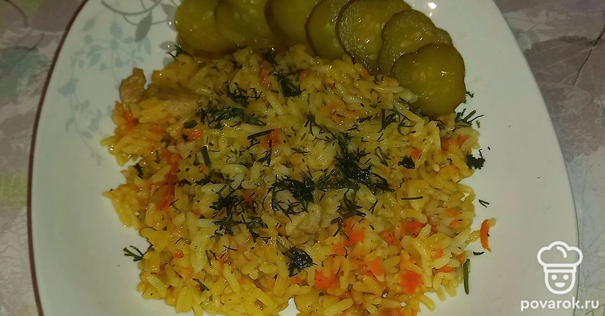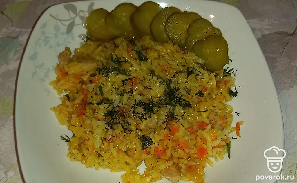 При подаче плова украсьте его зеленью и дополните соленым огурчиком. Приятного аппетита!