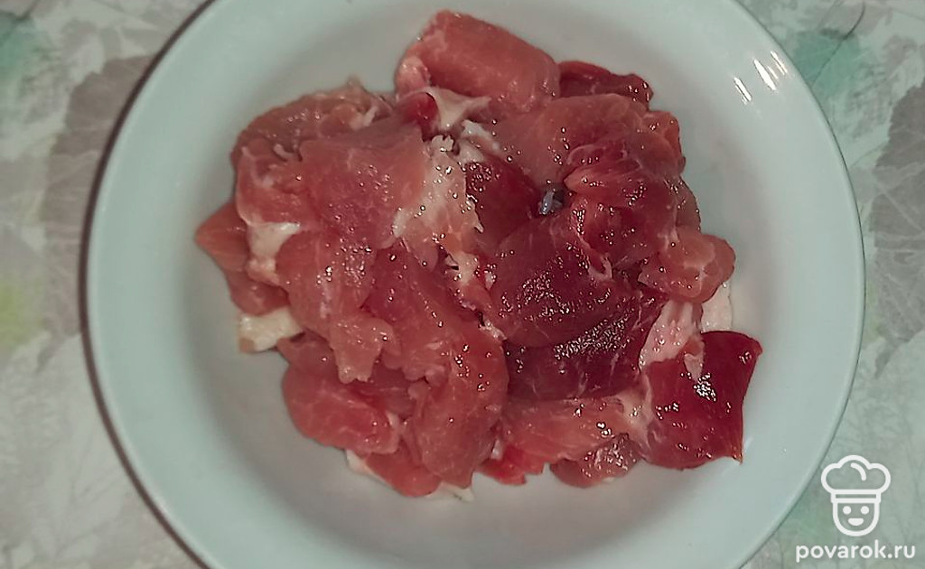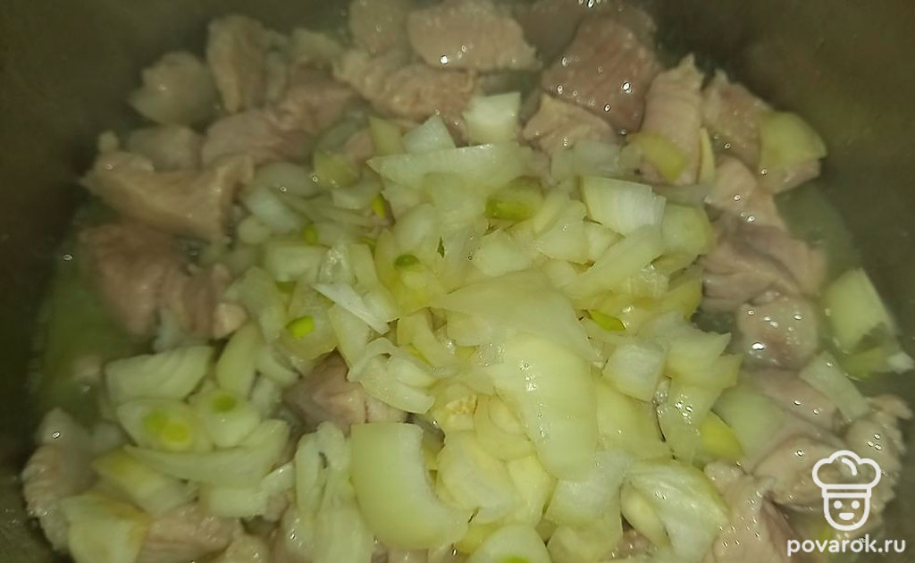 В разогретую толстостенную кастрюлю добавьте масло, мясо и репчатый лук. Обжаривайте мясо с луком до тех пор, пока лук не станет прозрачным.