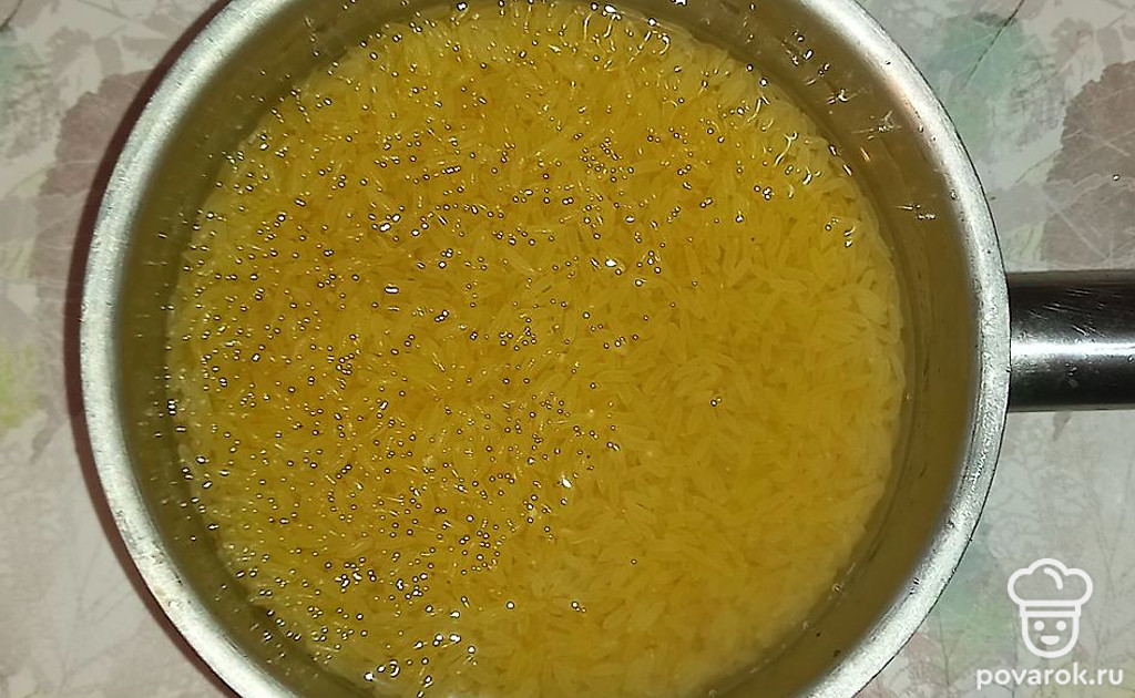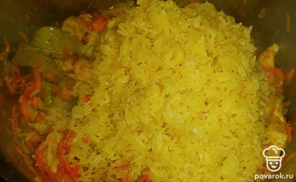 Когда морковь станет мягкой, всыпьте рис. Налейте воду так, чтобы она закрывала содержимое кастрюли на два пальца. Варите плов на среднем огне до готовности.