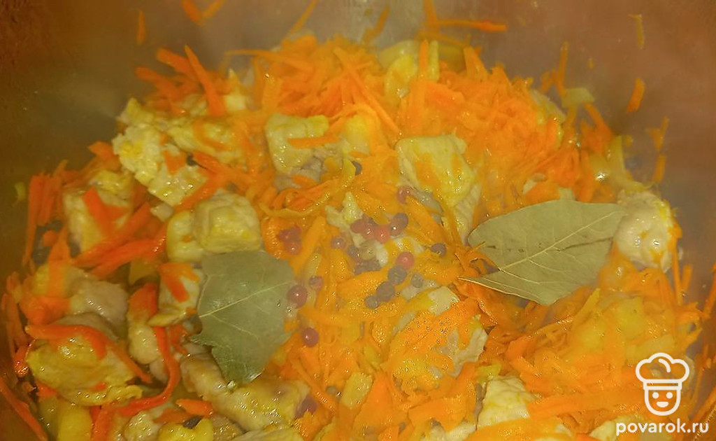 Выложите натертую на крупной терке морковь, лавровый лист, перец горошком, специи по вкусу.