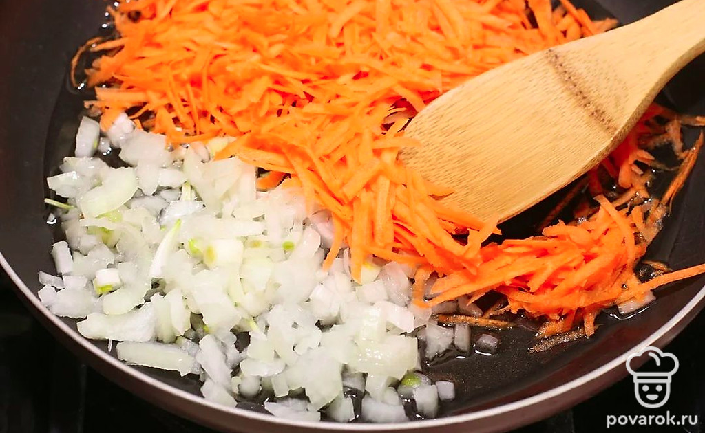Пока варится курица, нарежьте лук, натрите морковь.