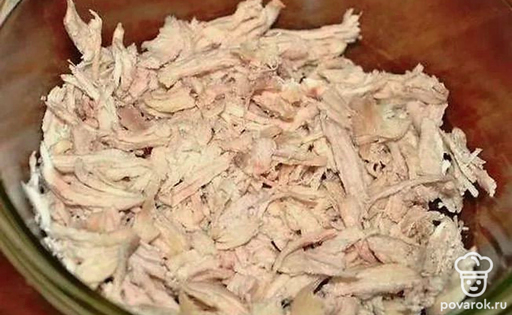 Когда куриная голень сварится, достаньте ее из бульона, дайте остыть. Когда остынет, отделите мякоть от костей.