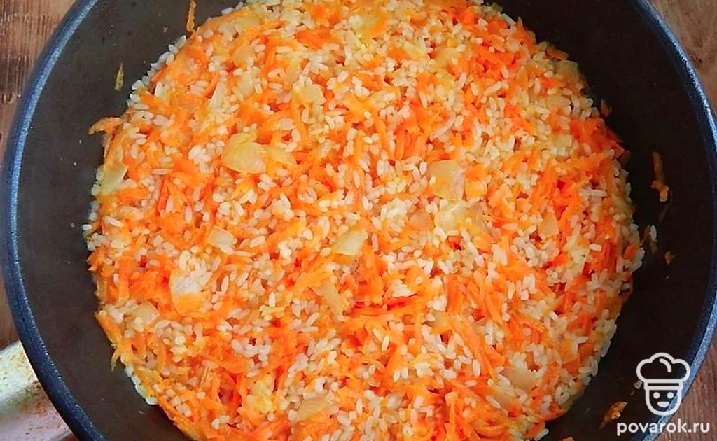Далее обжарьте лук и морковь до полуготовности. Добавьте мякоть курицы, еще немного обжарьте. В конце добавьте рис. Он тоже должен обжариться.