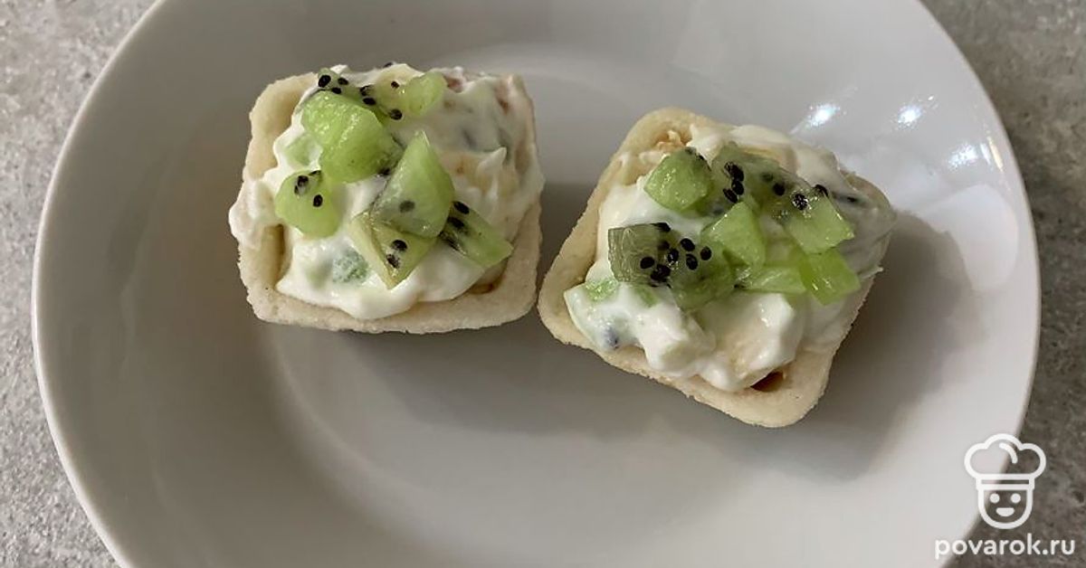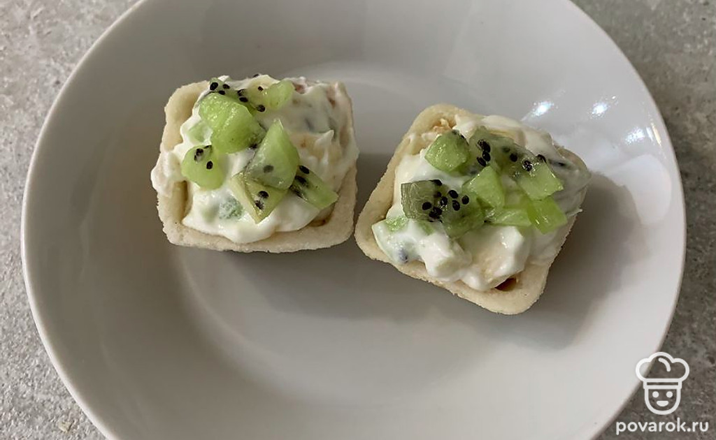 Наполните тарталетки начинкой. Сверху выложите киви. Тарталетки готовы.
