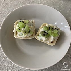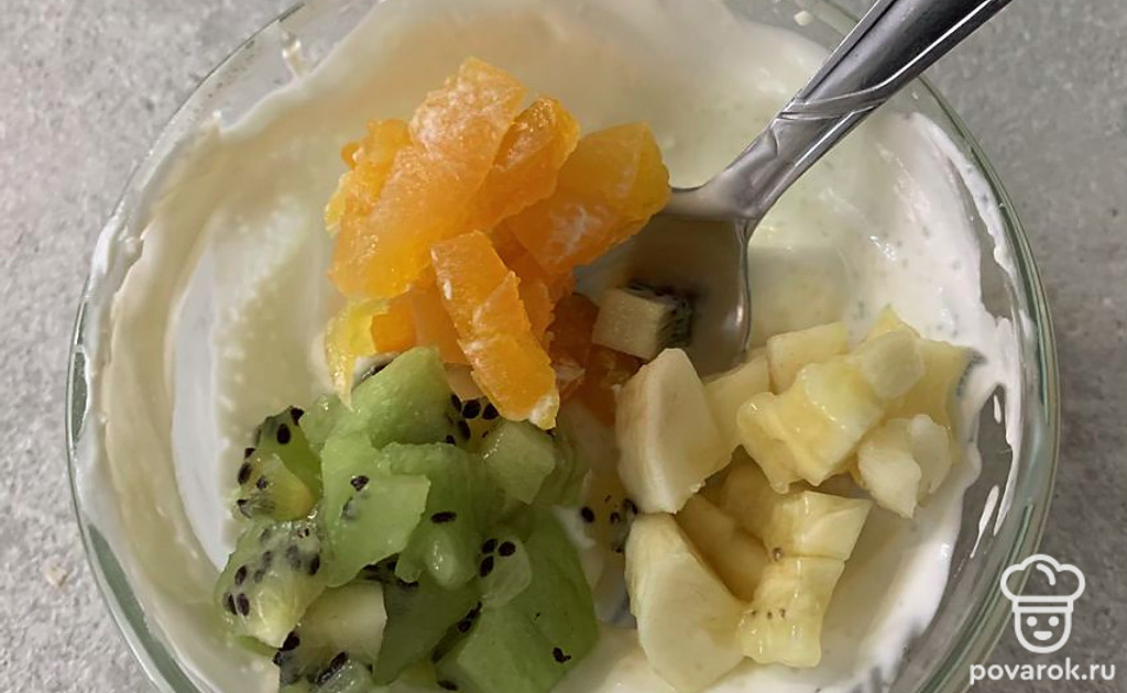 Смешайте фрукты с творожным кремом, часть киви оставьте для украшения.