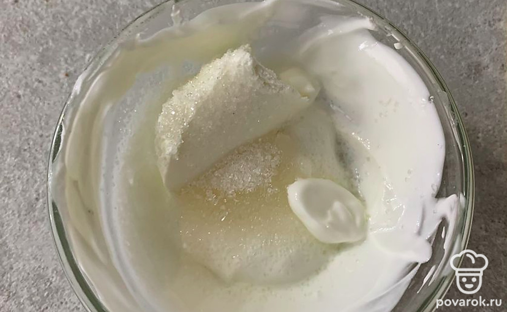 Смешайте творожный сыр, сметану и сахар.