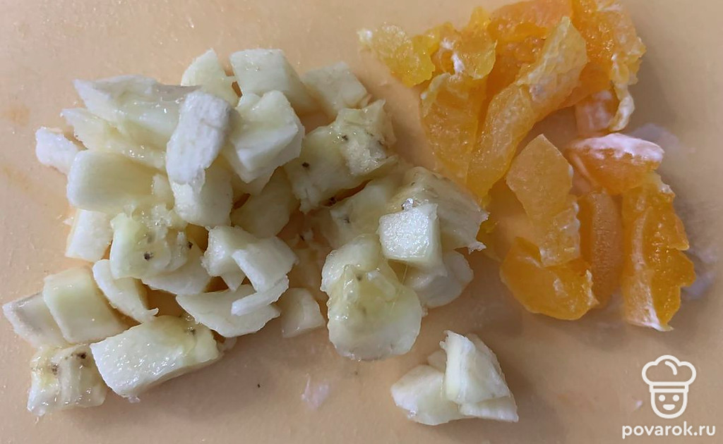 Мелко нарежьте банан и распаренную курагу.
