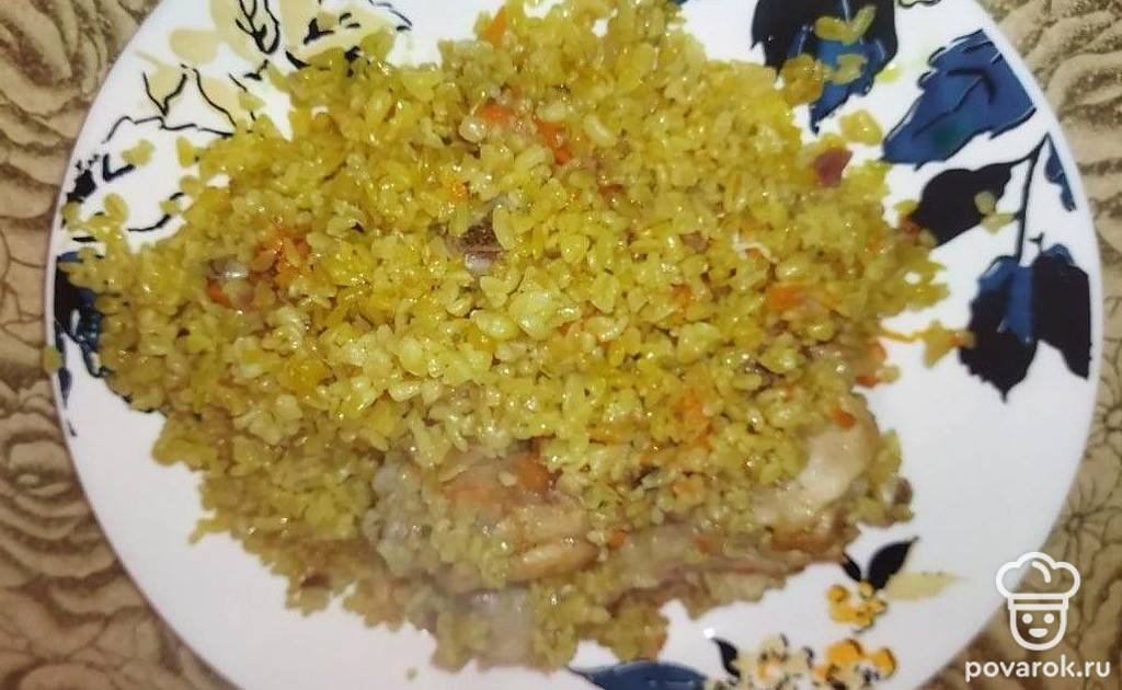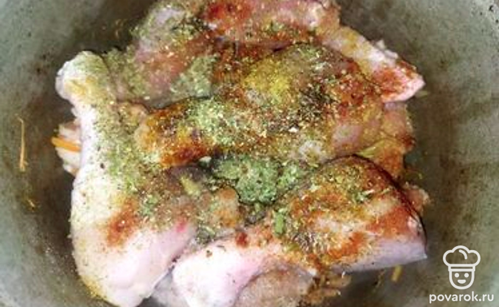 Далее добавьте к обжаренным овощам куриную голень и универсальную приправу. Томите 15 минут.