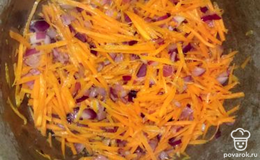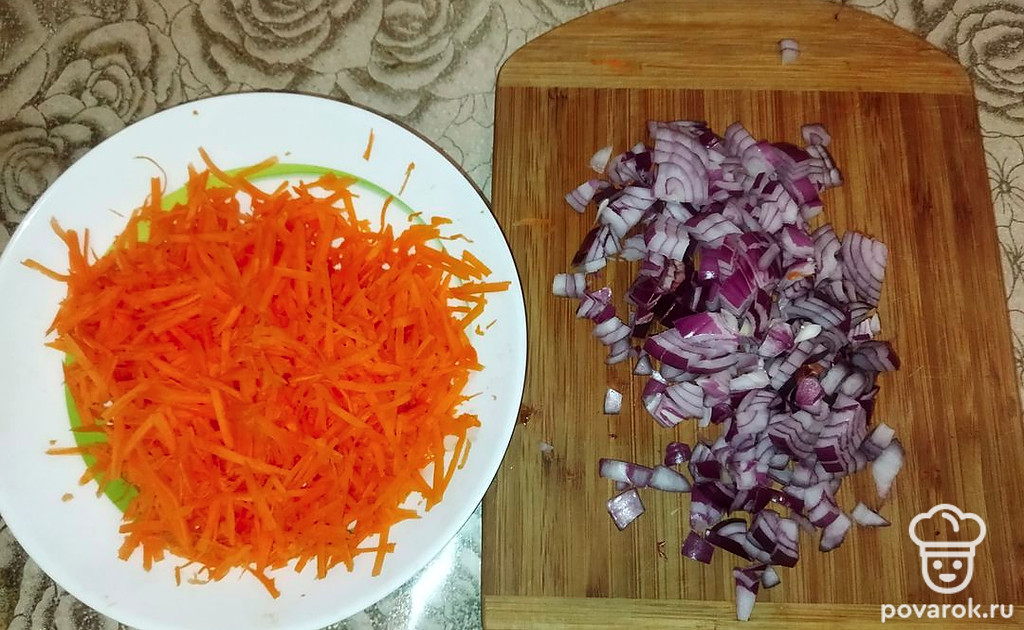 Нарежьте мелко красный репчатый лук. Натрите на терке по-корейски морковь.