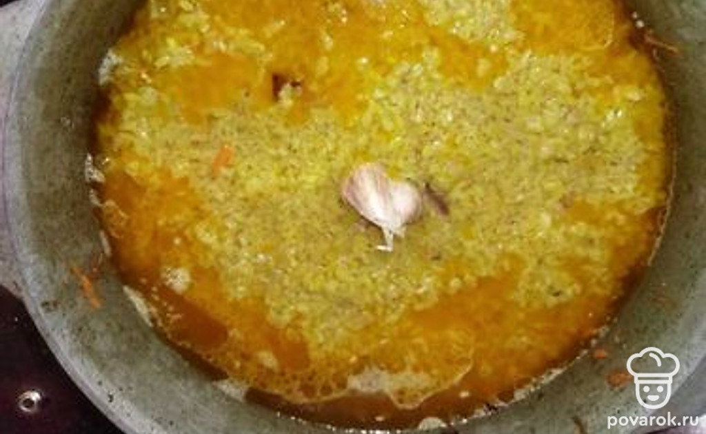 Залейте все сверху водой. В центр вставьте зубки чеснока. Накройте крышкой, оставьте томиться на медленном огне 40 минут.