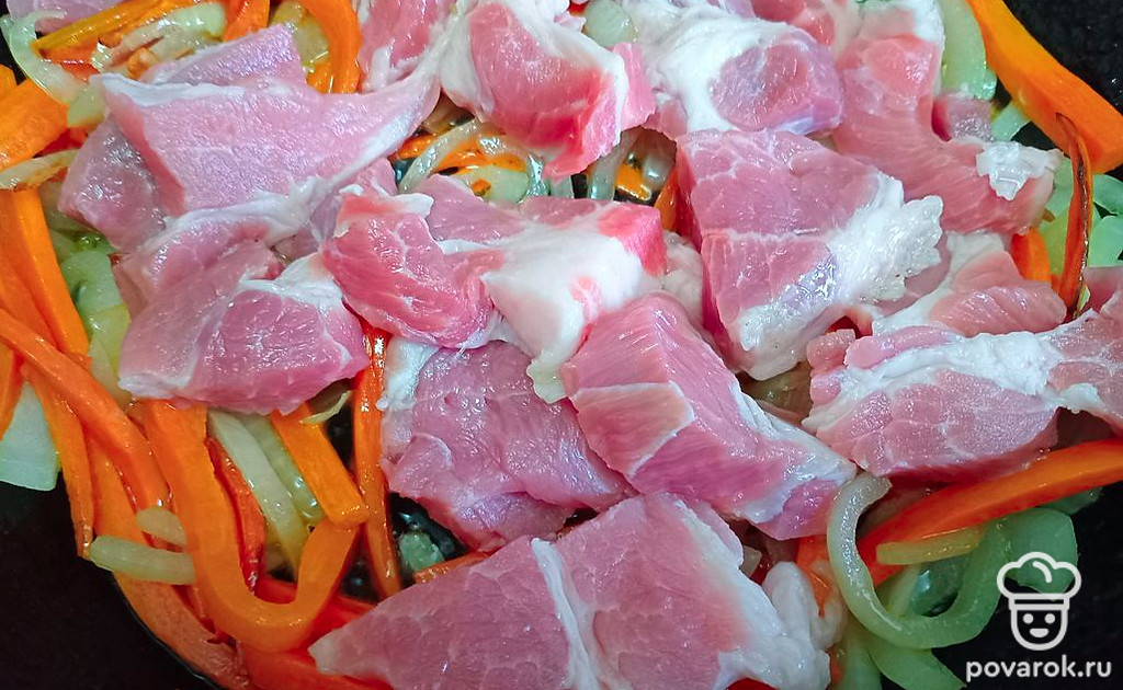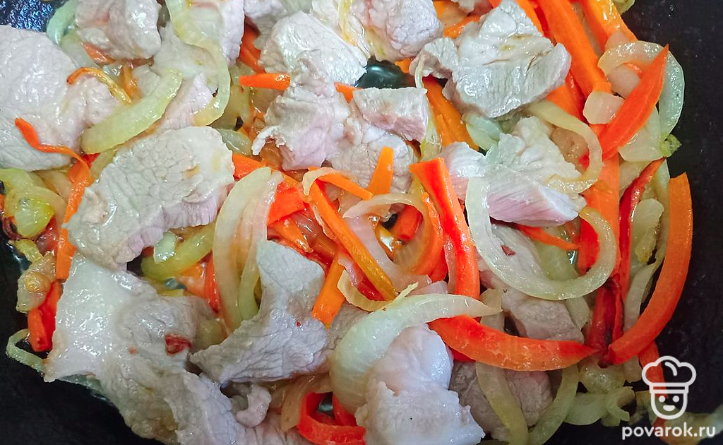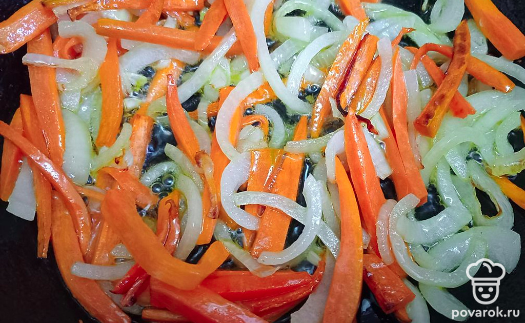Морковь нарежьте соломкой, репчатый лук — полукольцами. Выложите на сковороду и добавьте растительное масло.