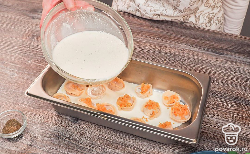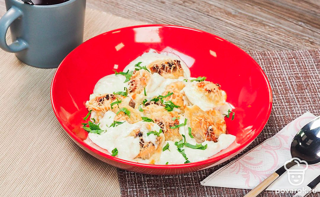 Для эффектной подачи посыпьте запеченные пельмени нашинкованной зеленью.