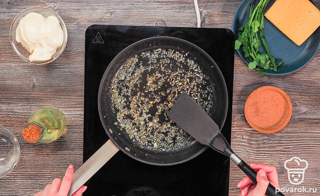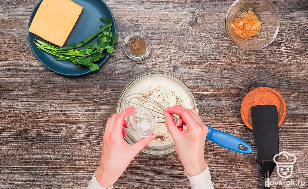 Пока обжаривается лук, майонез смешайте со 100 мл воды в глубокой тарелке. Добавьте специи и перемешайте.