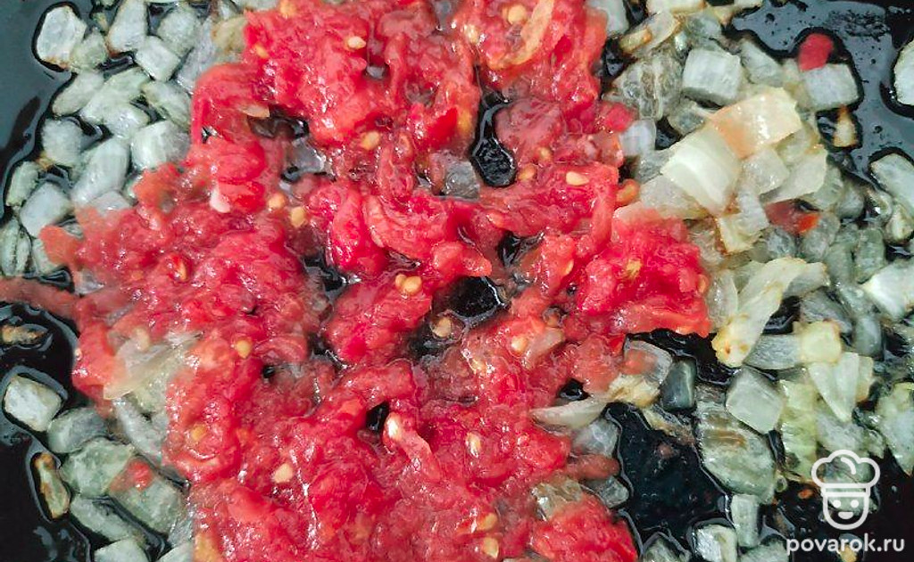 Мелко нарезанный лук обжарьте с морковью. Натрите на мелкой терке помидоры и добавьте к обжаренным овощам. Перемешайте.