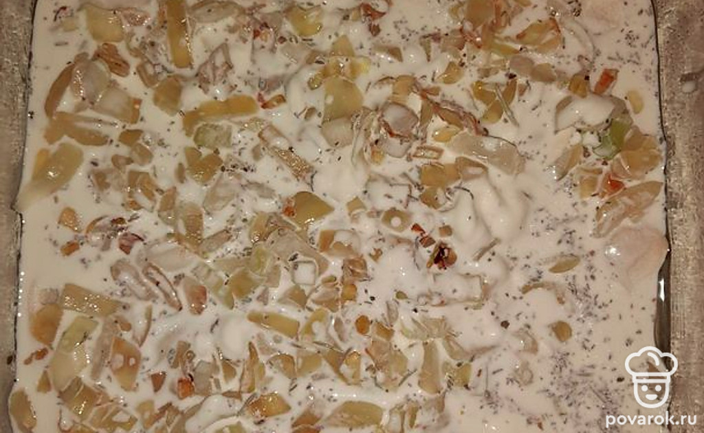 Залить соусом и поставить в разогретую духовку на 20-25 минут.