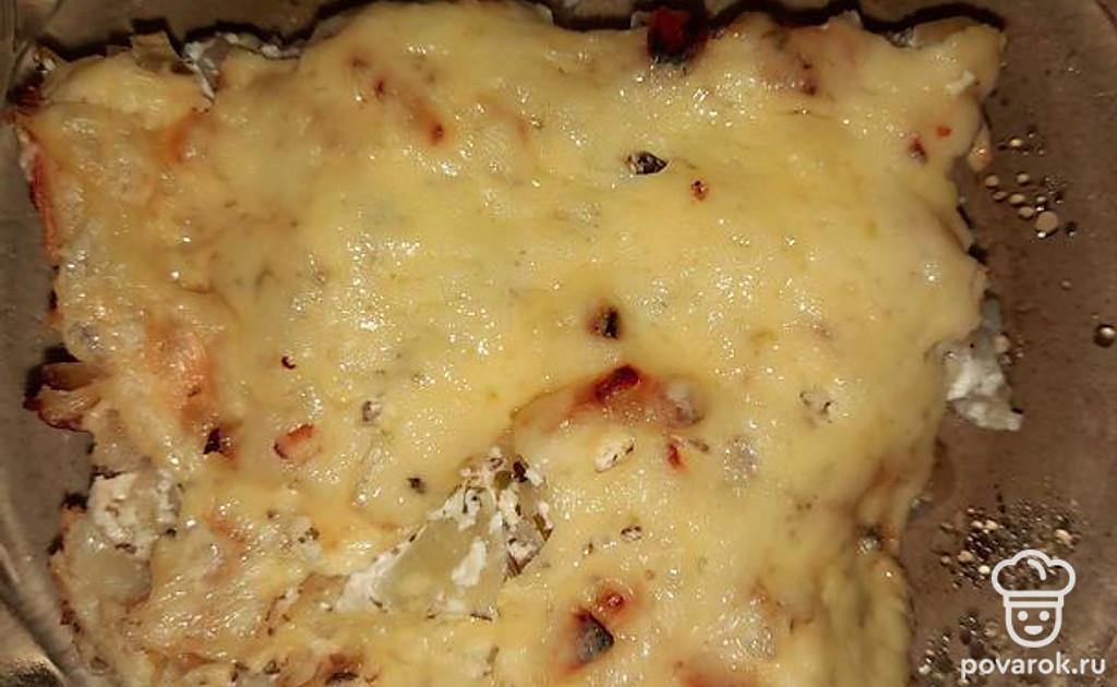 Пельмени, запеченные в сливочно-сметанном соусе с луком