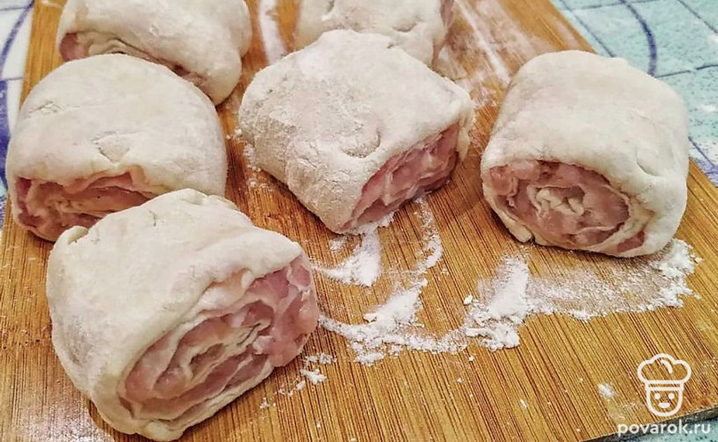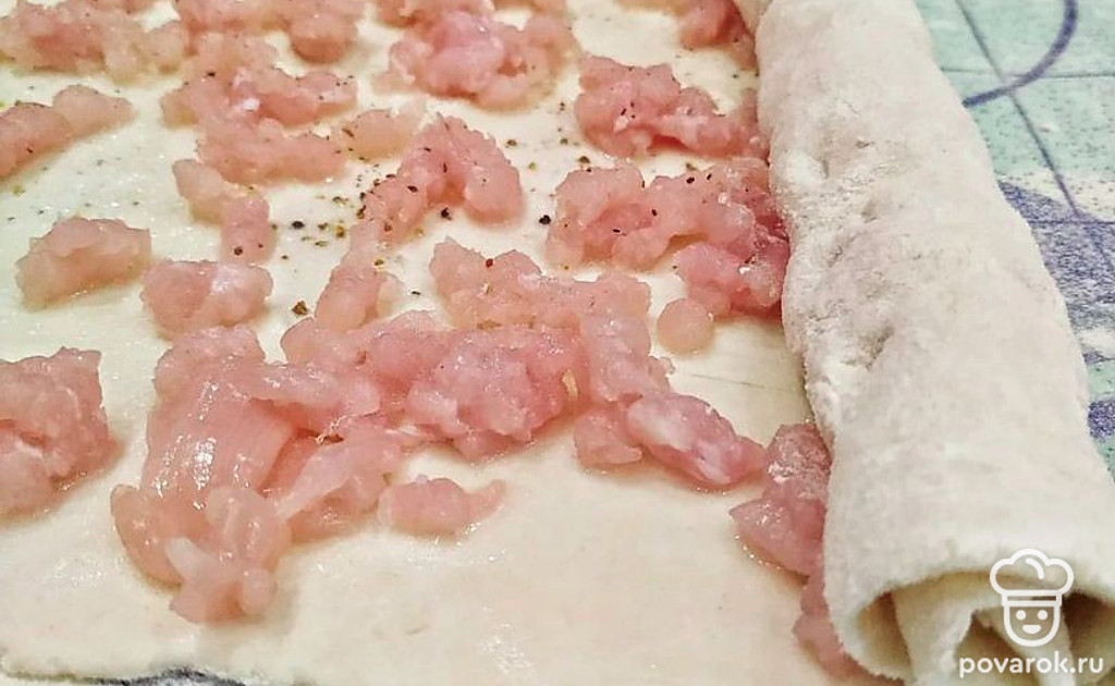 Раскатываем тесто и накладываем начинку, посыпаем специями и заворачиваем в рулет.