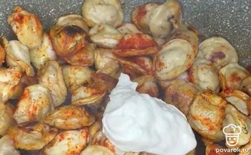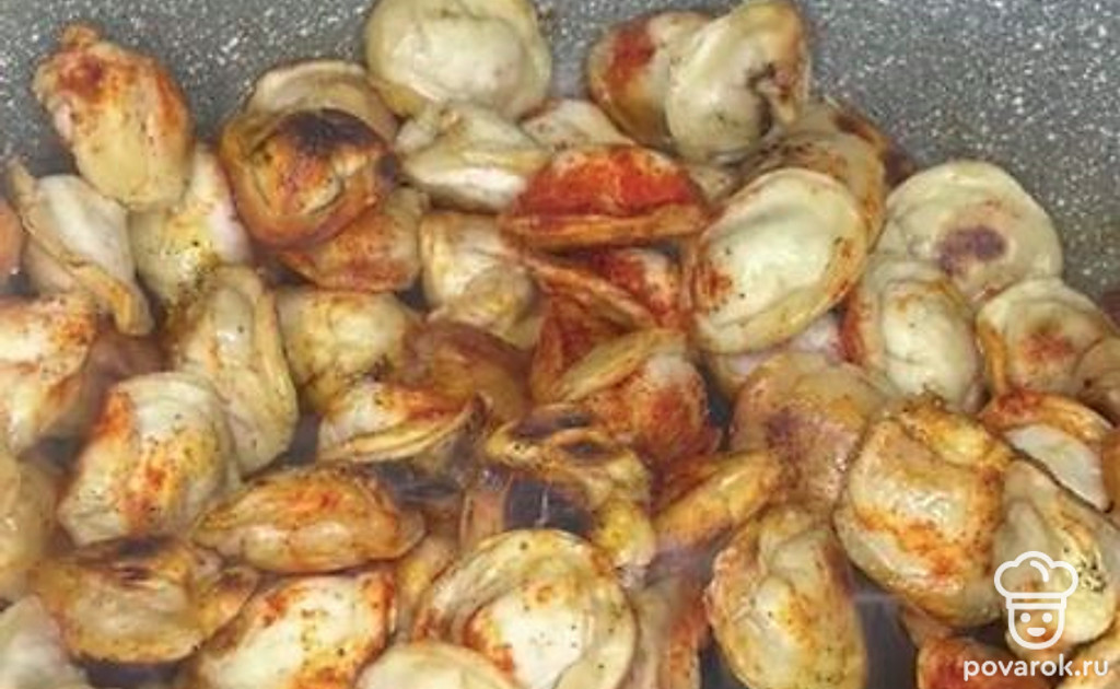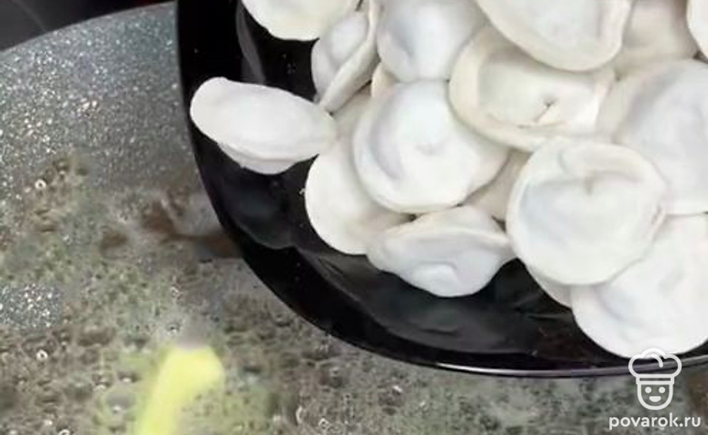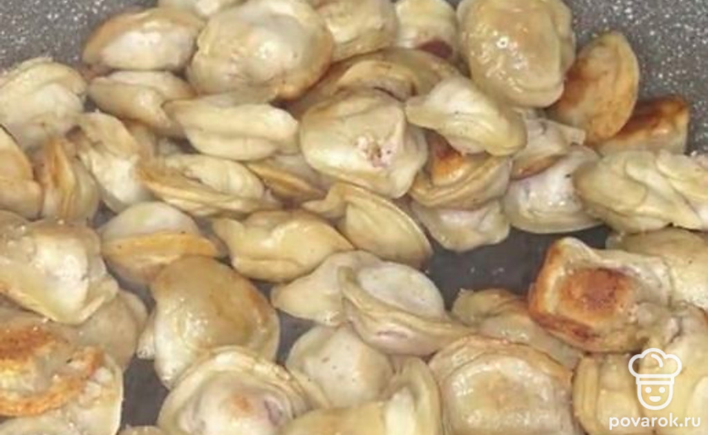Замороженные пельмени добавить на разогретую со сливочным маслом сковороду.