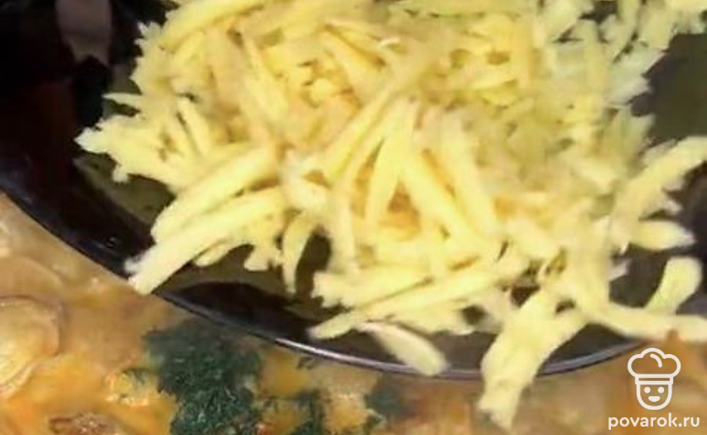 Добавить плавленый сыр. Опять накрыть крышкой и дождаться полного растворения сыра.