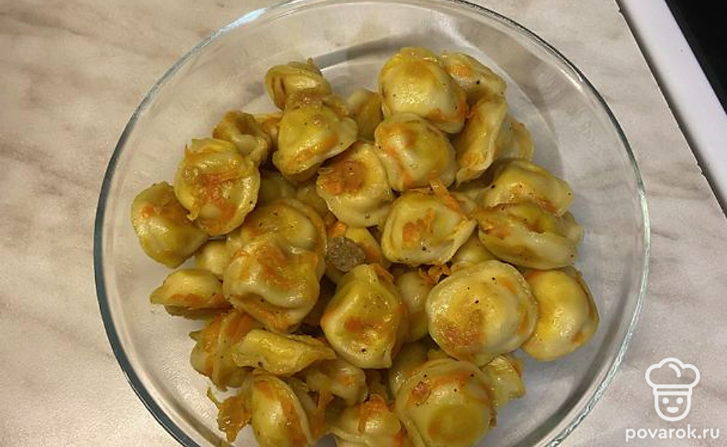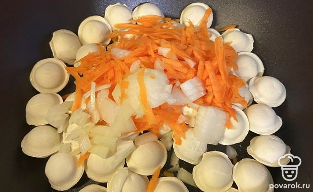 Один из вариантов приготовления пельменей. Морковь с луком придают изюминку блюду.