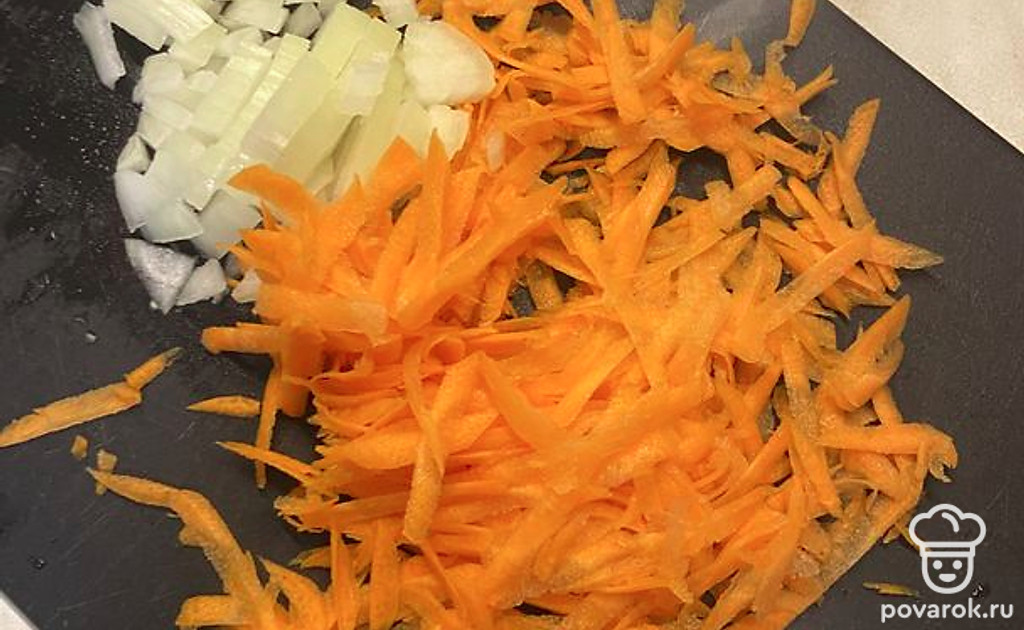 Нарезаем лук, натираем морковь на средней терке.