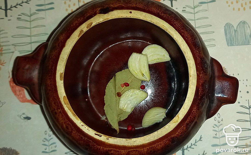 На дно горшочка положите лавровый лист, чеснок, разрезаный на две части, розовый перец горошком.