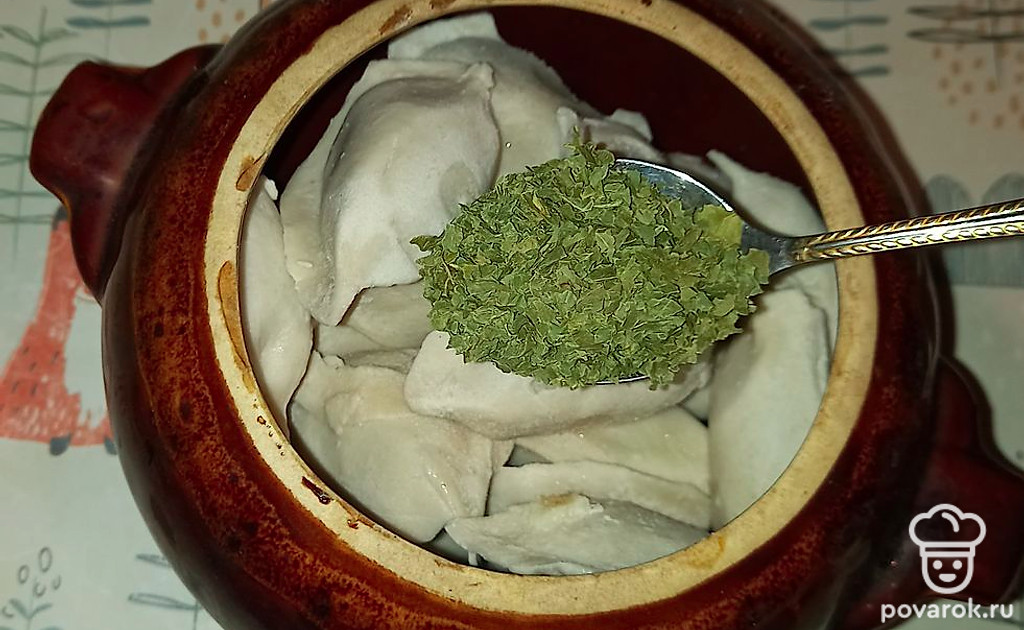 Замороженные пельмени с курицей выложите в горшочек. Добавьте одну чайную ложку с горкой сушеных листьев хрена, соль по вкусу.