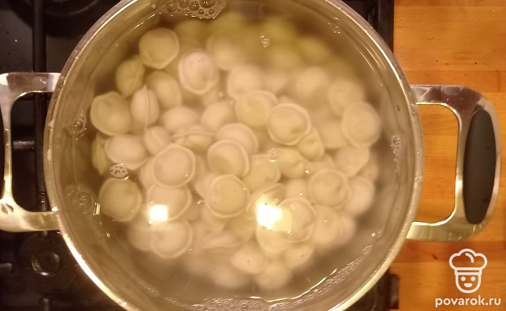Вскипятите воду в кастрюле. После закипания аккуратно всыпьте пельмени в воду, накройте крышкой. Дождитесь повторного закипания. После этого откройте крышку, включите минимальный огонь и варите еще 10 минут.
