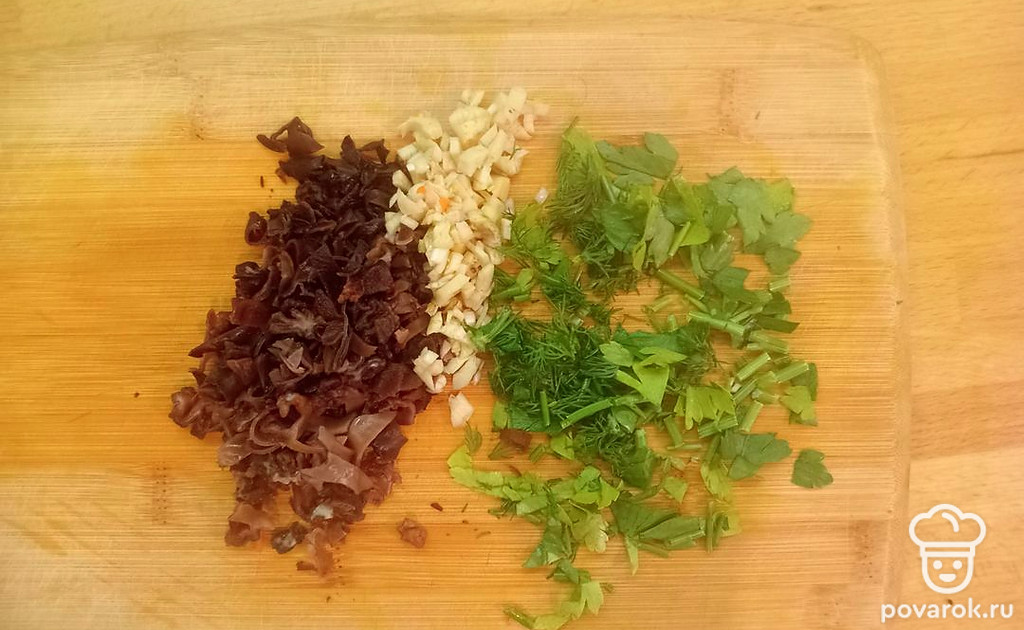 Пока варятся пельмени, подготовьте овощи. Мелко нарежьте грибы, чеснок и зелень.