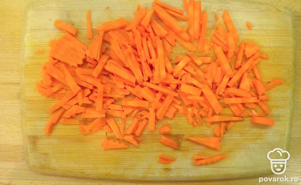 Морковь нарежьте мелкой соломкой или натрите на терке.